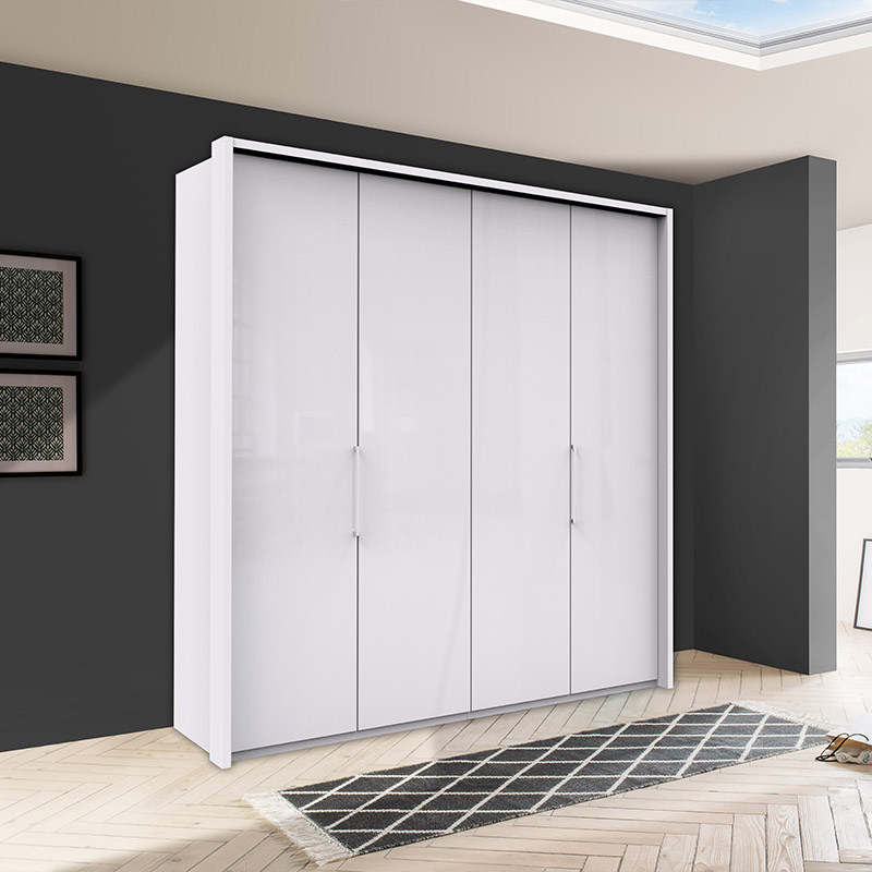 Choose from four or six section options, each in two widths; add an extending or walk in corner unit; and then complement with a delightful matching bed and faux leather covered headboard and storage cupboards and chests with striking chrome sliders in place of the usual feet or legs (although you can get neat, near invisible feet too, if you prefer)!